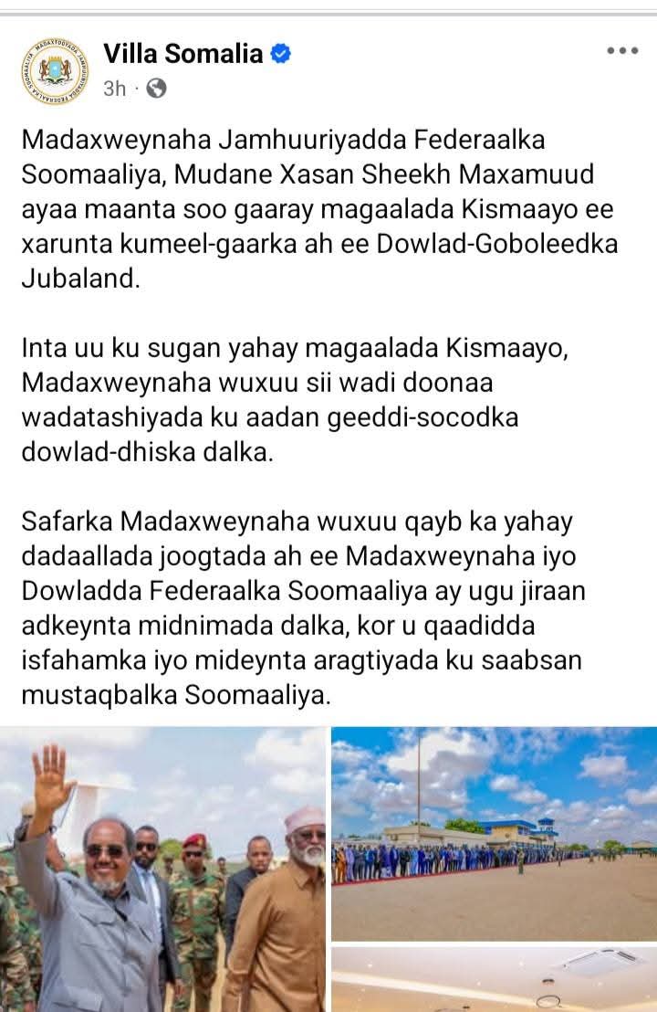 KISMAYO (Kaab TV) – The much-anticipated meeting between Somalia’s Federal President Hassan Sheikh Mohamud and Jubaland State President Ahmed Mohamed Islam (commonly known as Ahmed Madobe) has officially collapsed after more than four hours of intense negotiations that began last night in the port city of Kismayo.