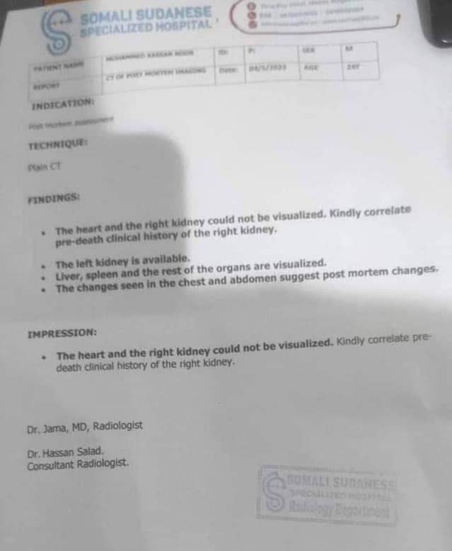 Per the autopsy report done by the Somali Sudanese Specialized Hospital it concluded that the heart & the right kidney of Mohamed could not be visualized and that changes seen in the chest & abdomen suggest post mortem changes.