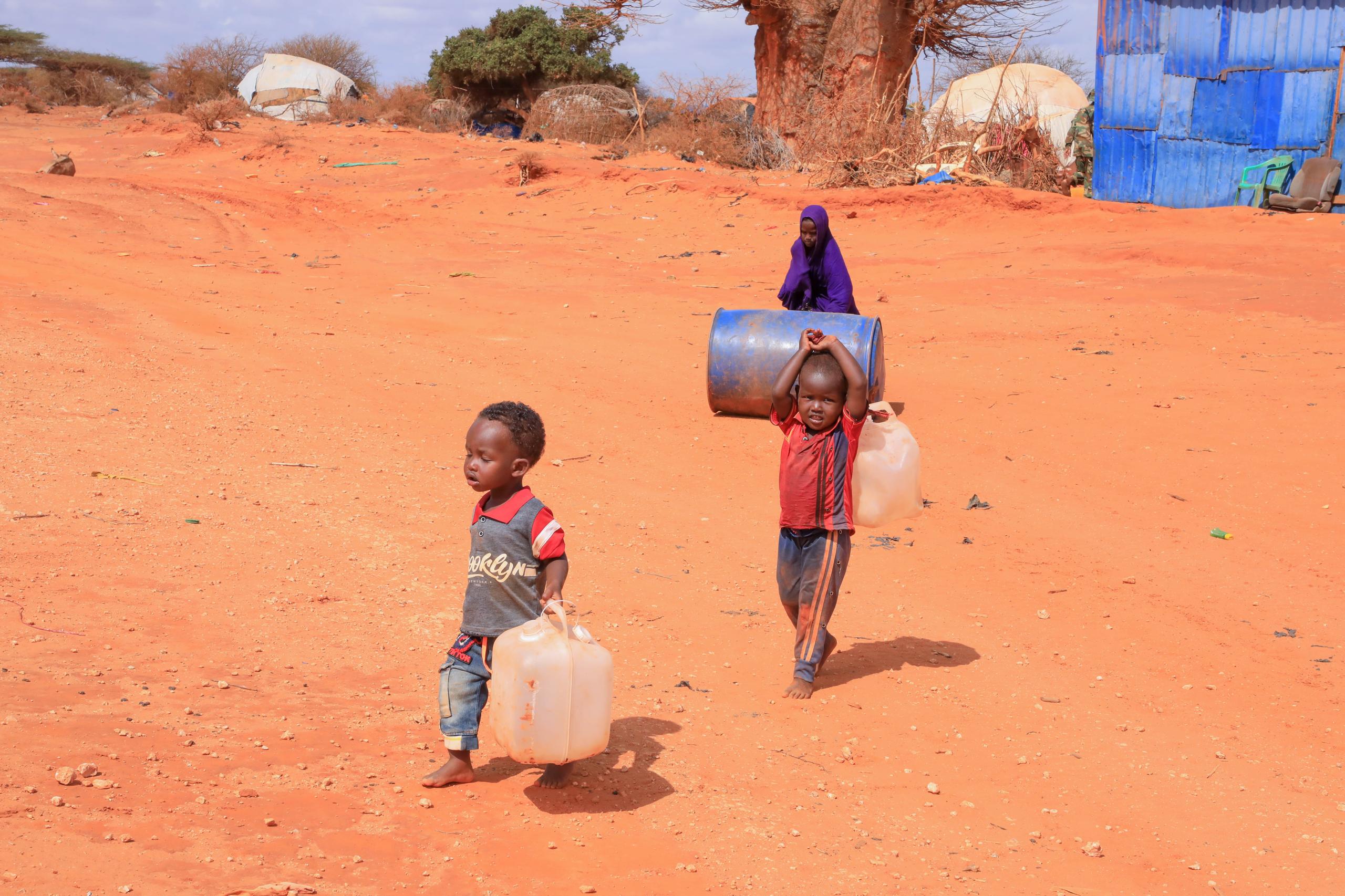 Children carry jerrycans in Barkadda Shariifadda village, about 13 km west of Kismayo, Jubaland, while waiting for a water trucking vehicle brought by an NGO from Kismayo. This is the only water the community can access to survive. PHOTO/ABDULLAAHI HUSSEIN KILAS/ KAAB TV.
