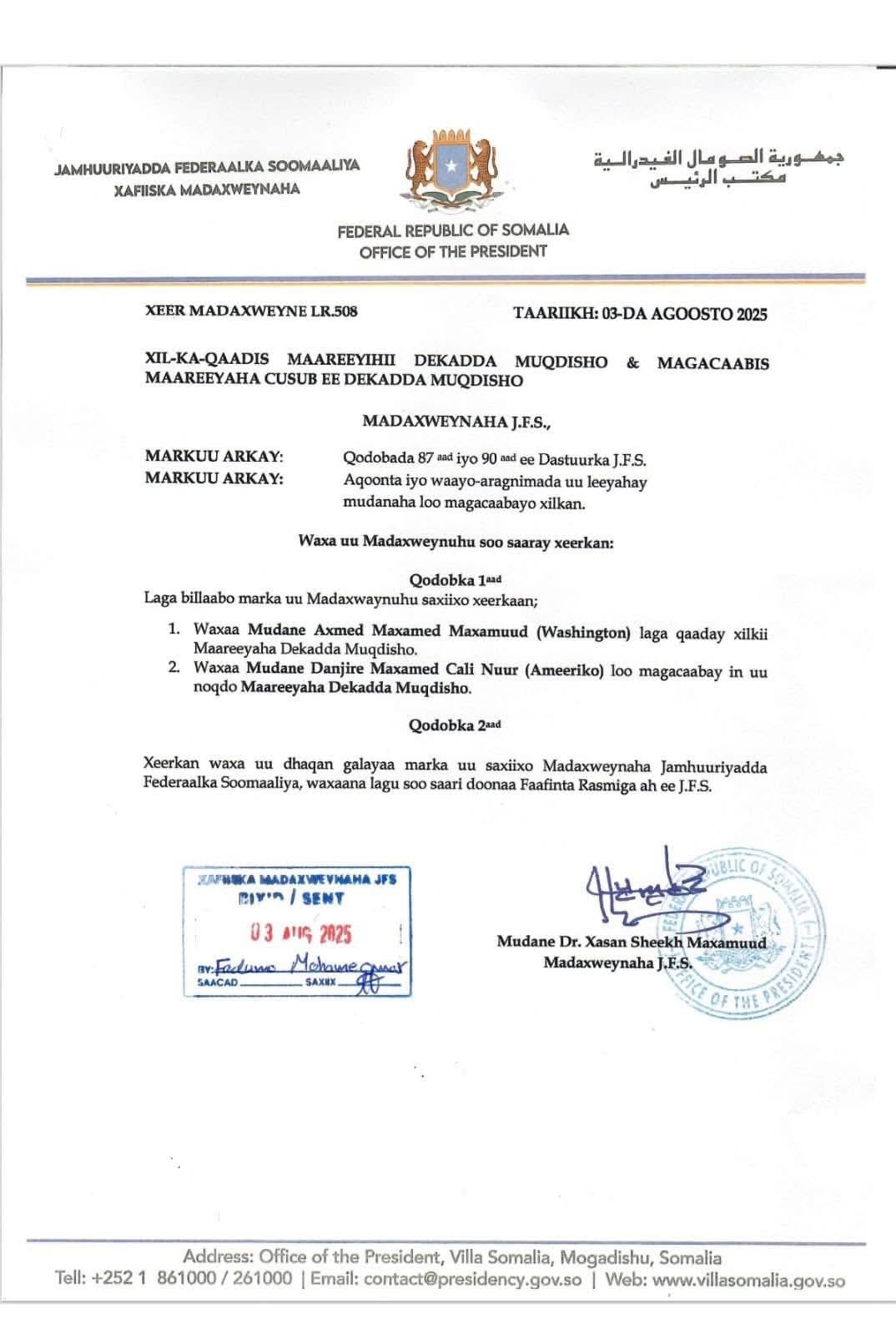 Decree of appointment of Ex-ambassador Mohamed Ali Nur as Port Manager.
