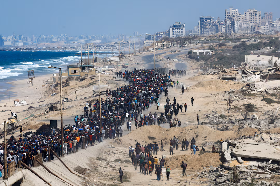 A huge column of displaced Gazans filed north through the dust and rubble towards Gaza City, the enclave’s biggest urban area, which had been under attack just days ago in one of Israel’s biggest offensives of the war.