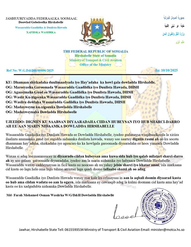 According to the Ministry, it is now explicitly prohibited for aircraft carrying military personnel, weapons, or military equipment to land in any of the airports operating within Hirshabelle State unless they have obtained prior approval and clearance through the established governmental channels.