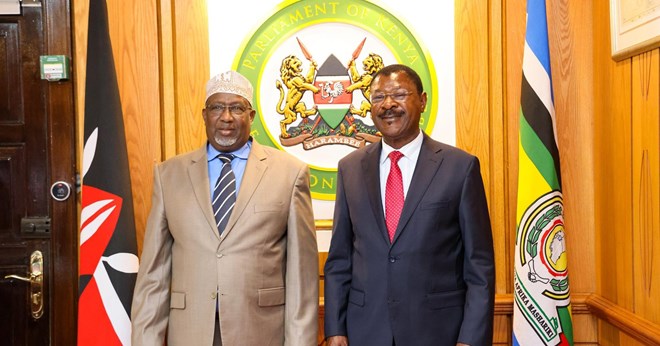Nairobi (KAAB TV) – The Speaker of Somalia’s House of the People, Sheikh Aden Mohamed Noor “Madobe”, held an important meeting in Nairobi with Moses M. Wetang’ula, Speaker of the Kenyan National Assembly, as part of ongoing efforts to enhance cooperation between the two neighboring nations and within the broader East African region.