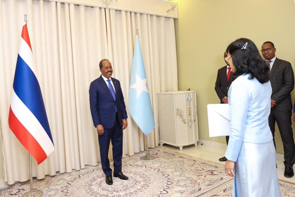 The President of the Federal Republic of Somalia, Mr. Hassan Sheikh Mohamud, received the diplomatic credentials from the new ambassadors of Turkey, Burundi and Thailand appointed to Somalia.