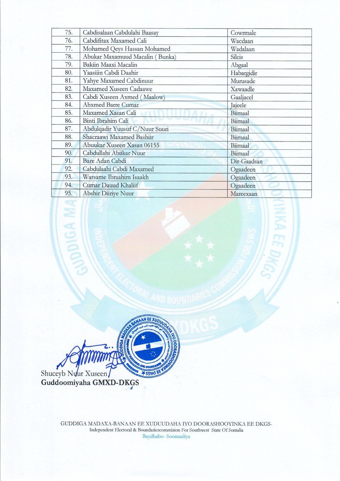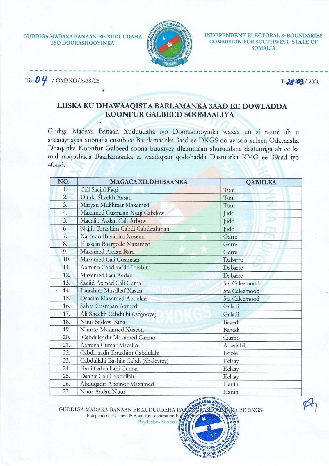 BAYDHABO (Kaab TV) – South West State of Somalia formed a new parliament last night (27 March 2026), consisting of 95 members, as announced by the South West State Electoral Commission.