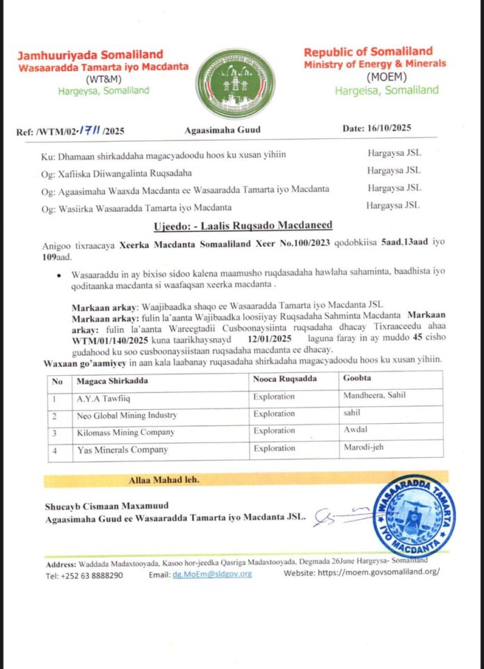 The revoked licenses cover various mineral extraction operations, including precious metals and industrial minerals, which are vital to Somaliland’s growing mining economy.