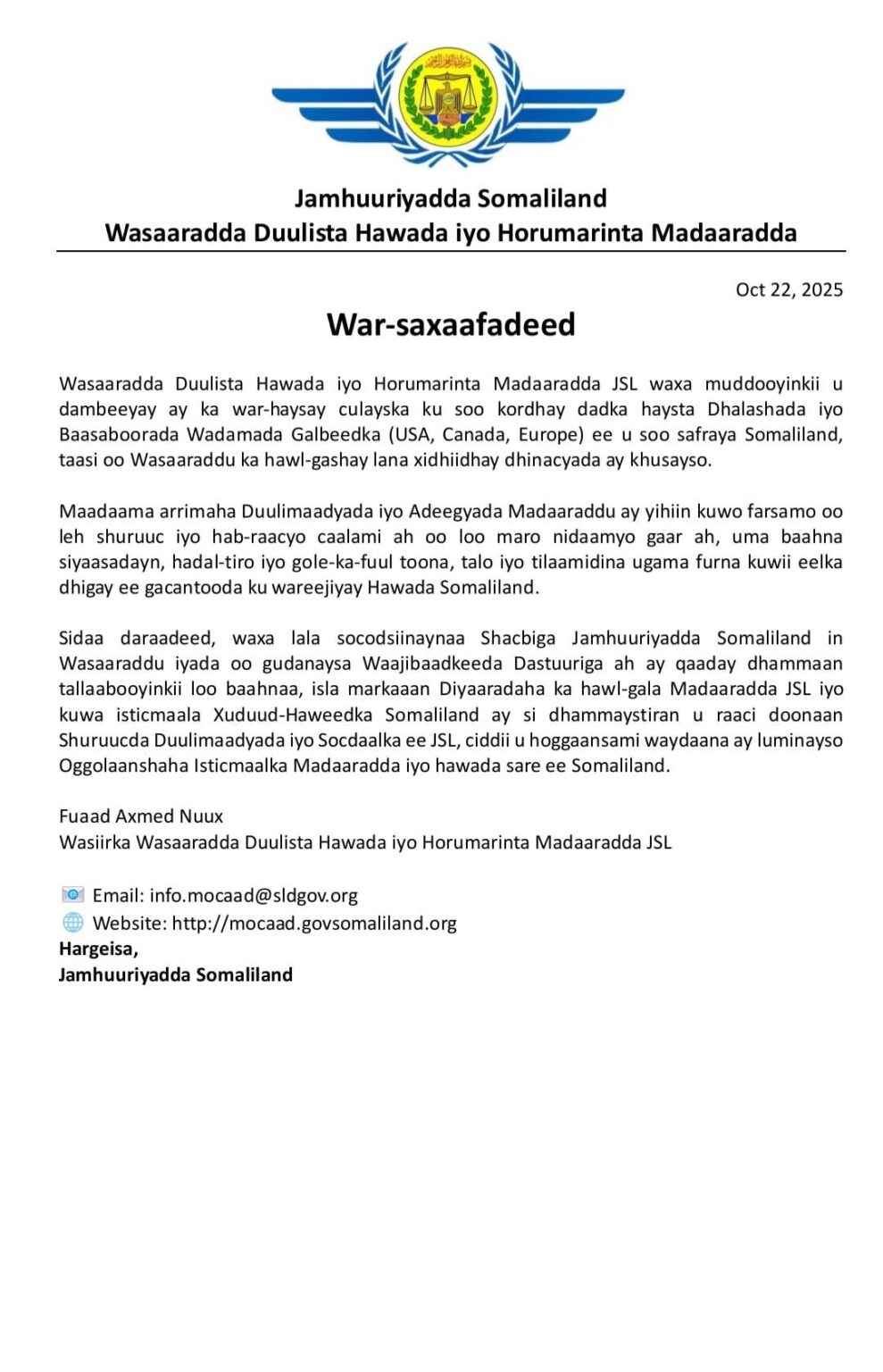 “The Ministry, in fulfilling its constitutional responsibilities, has taken all necessary measures to ensure that every airline operating at Somaliland airports or using Somaliland’s airspace complies fully with the Aviation and Travel Laws of the Republic of Somaliland,” Minister Fu’ad stated.